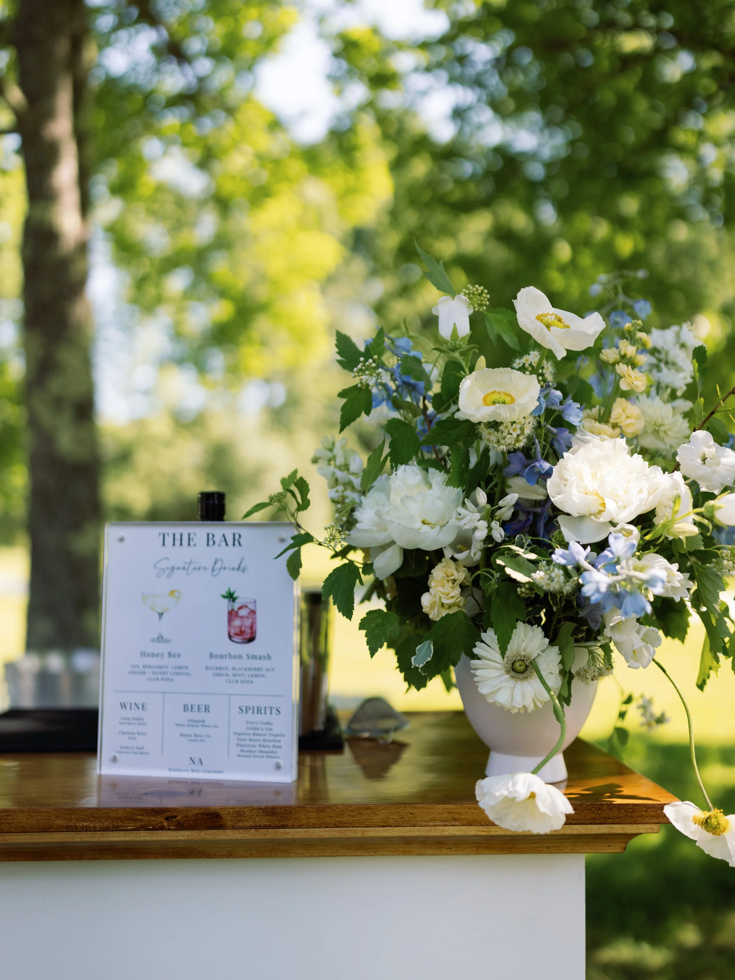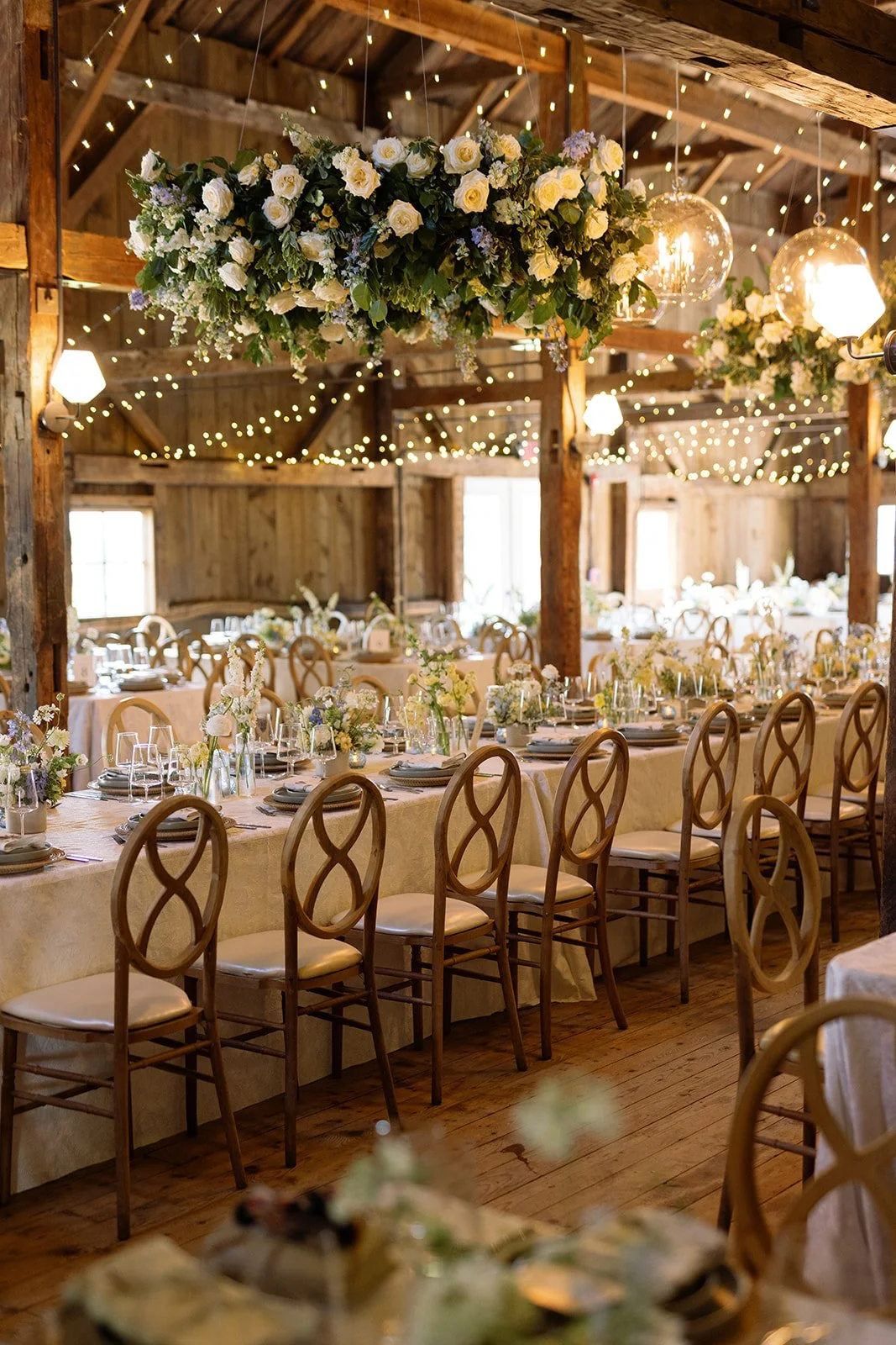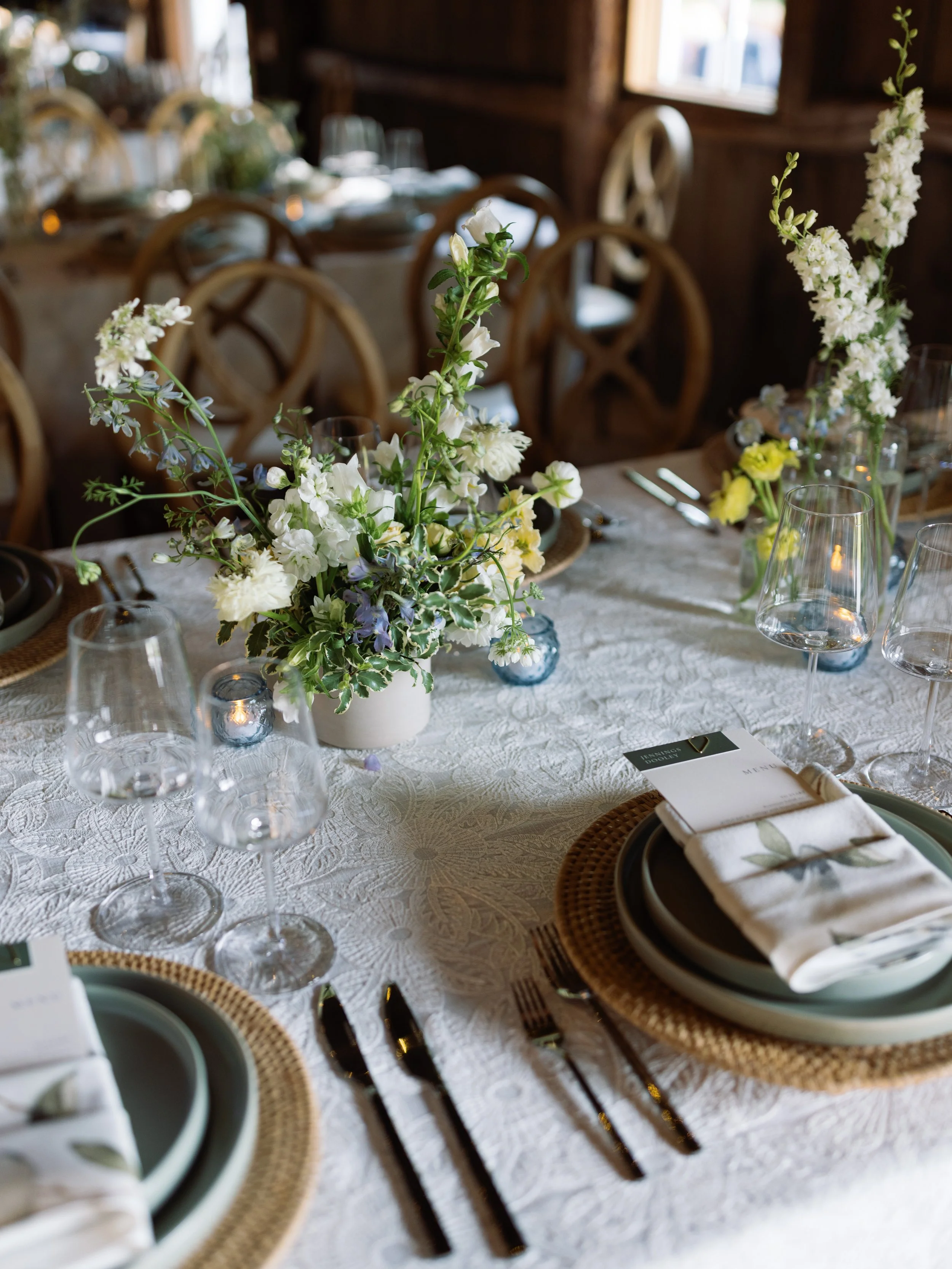 Jackie and Daniel’s June wedding was a seamless blend of spring and summer, brought to life through a fresh palette of blue, green, yellow, and white. The colors added a soft vibrancy, beautifully complementing the natural warmth of the wooded setting. Surrounded by rolling fields and a clear blue sky, guests cheered as Jackie and Daniel were pronounced husband and wife. Inside the barn, textured linens and woven rattan elements layered in an organic, effortless aesthetic, a hallmark of rustic yet refined wedding design in Maine. Overhead, hanging floral rings paired with delicate glass orb lights created an airy, glowing ambiance that balanced modern elegance with romantic charm. The result was a celebration that felt light, cohesive, and quietly stunning— capturing the essence of an early summer wedding with ease.