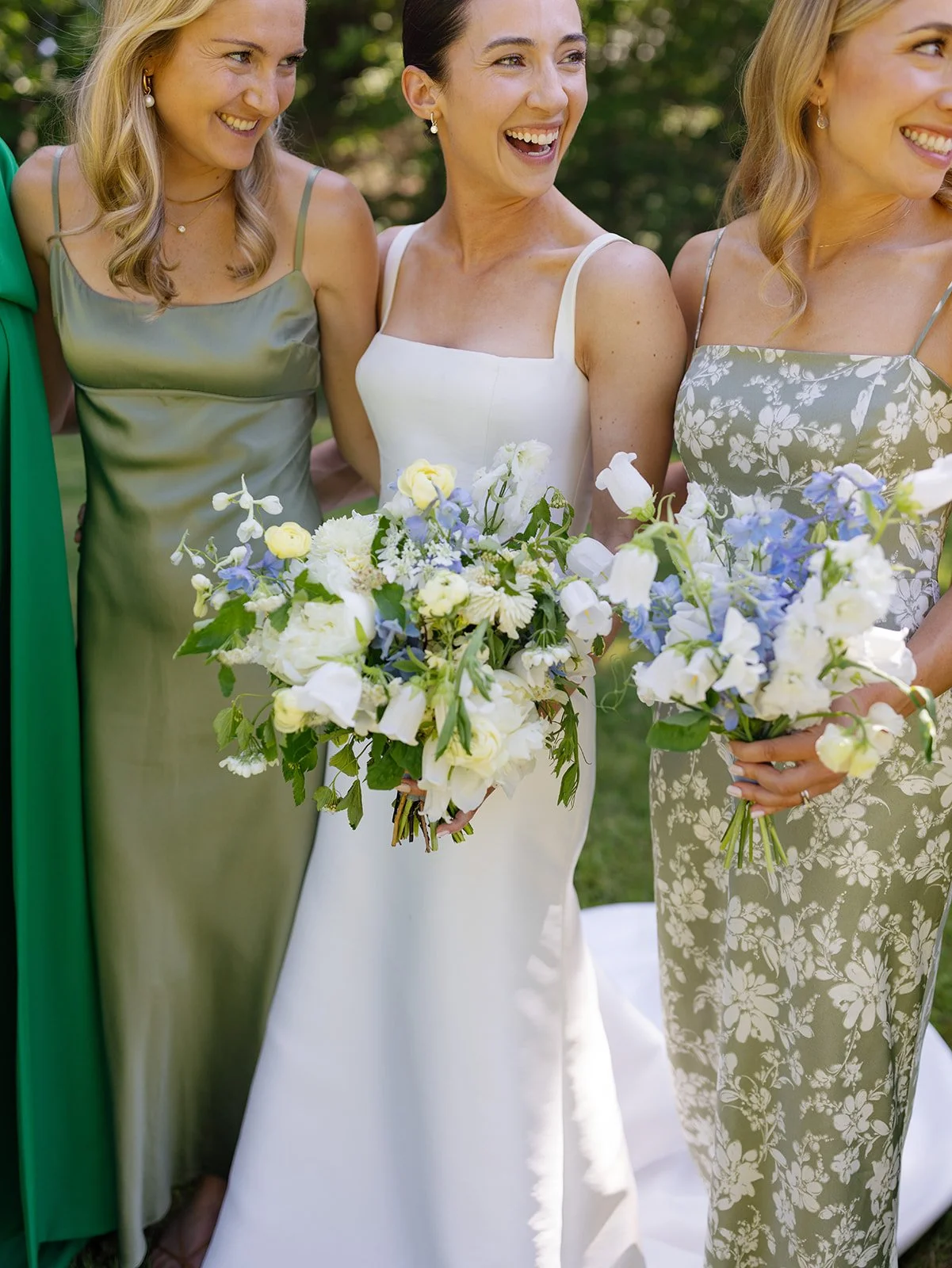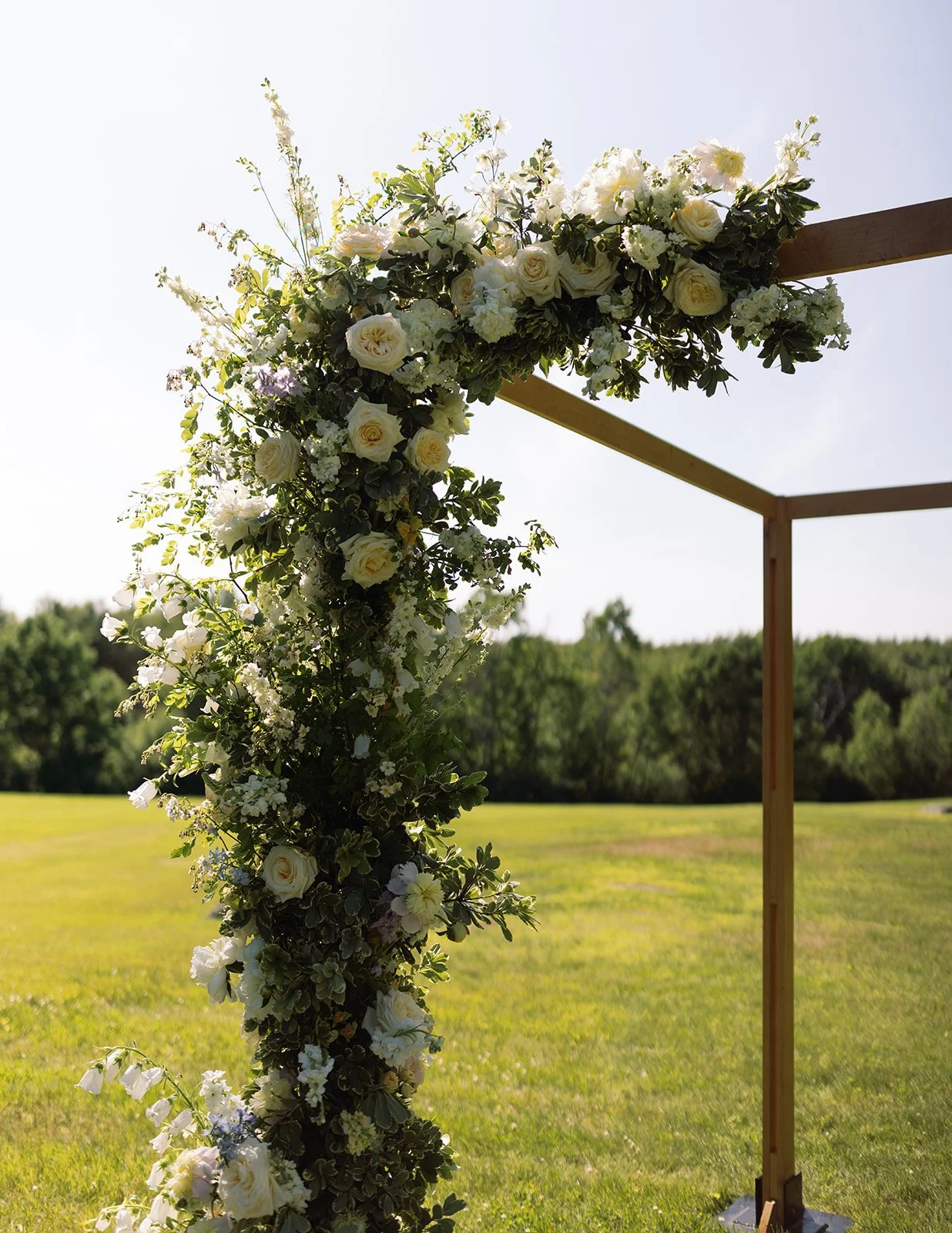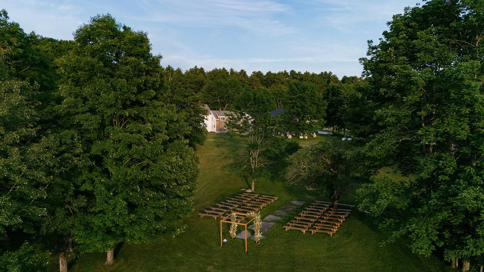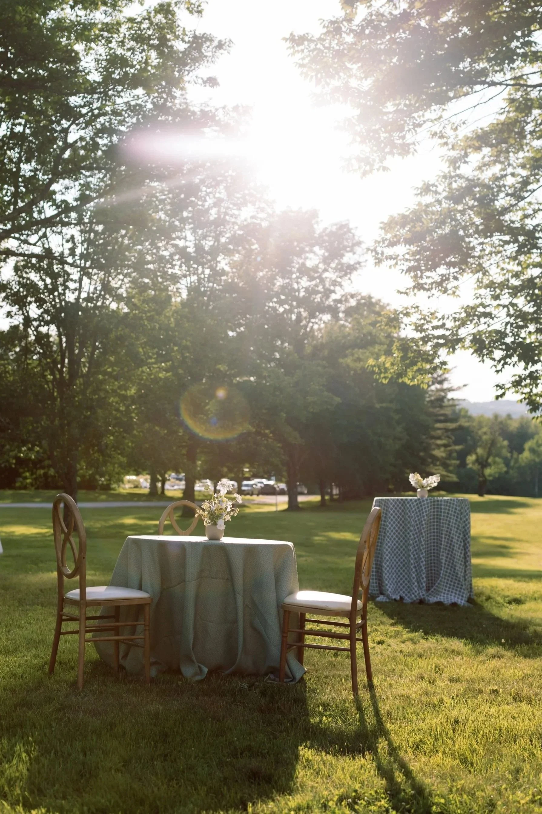 Jackie and Daniel’s June wedding was a seamless blend of spring and summer, brought to life through a fresh palette of blue, green, yellow, and white. The colors added a soft vibrancy, beautifully complementing the natural warmth of the wooded setting. Surrounded by rolling fields and a clear blue sky, guests cheered as Jackie and Daniel were pronounced husband and wife. Inside the barn, textured linens and woven rattan elements layered in an organic, effortless aesthetic, a hallmark of rustic yet refined wedding design in Maine. Overhead, hanging floral rings paired with delicate glass orb lights created an airy, glowing ambiance that balanced modern elegance with romantic charm. The result was a celebration that felt light, cohesive, and quietly stunning— capturing the essence of an early summer wedding with ease.