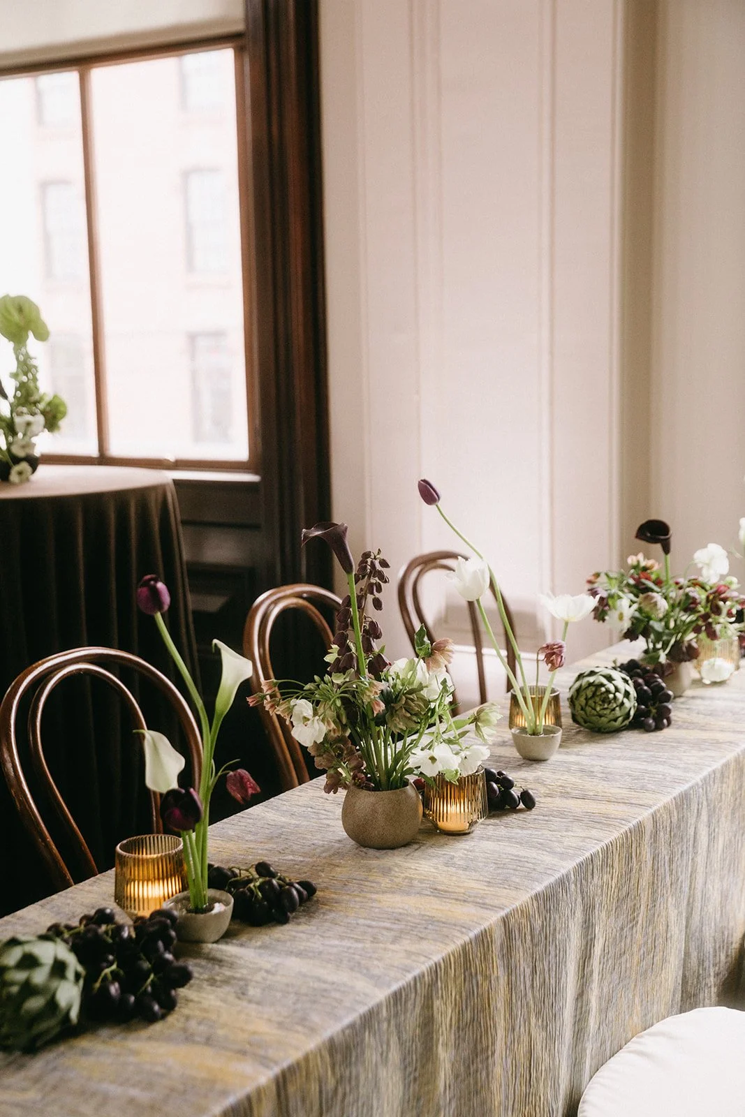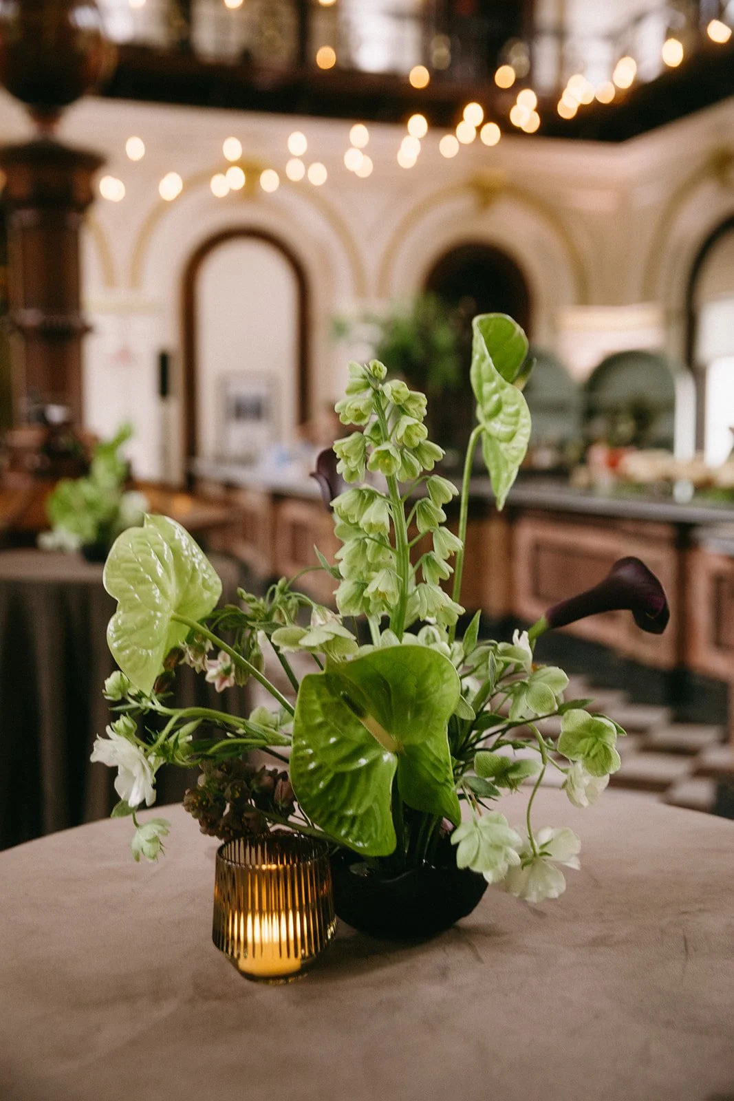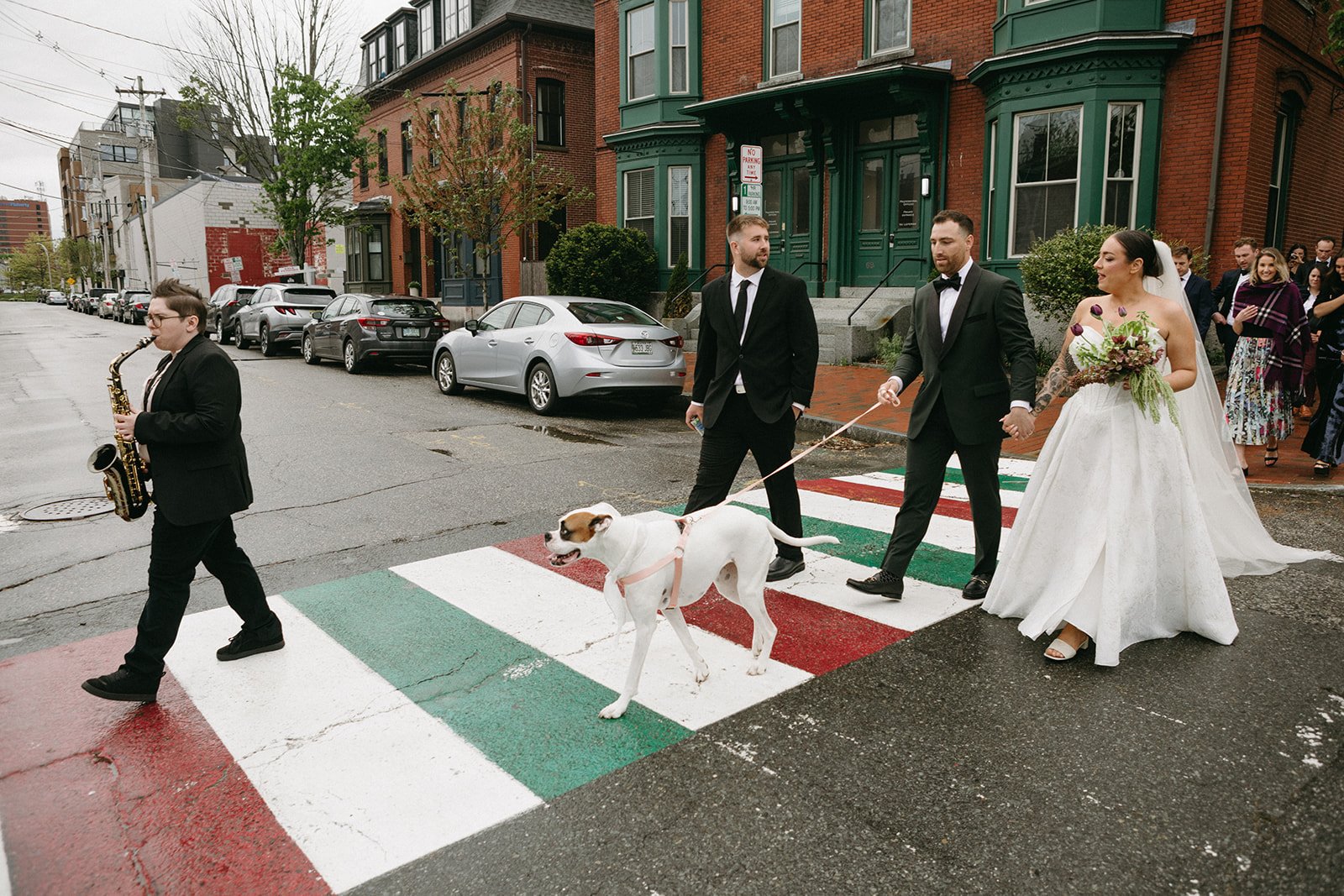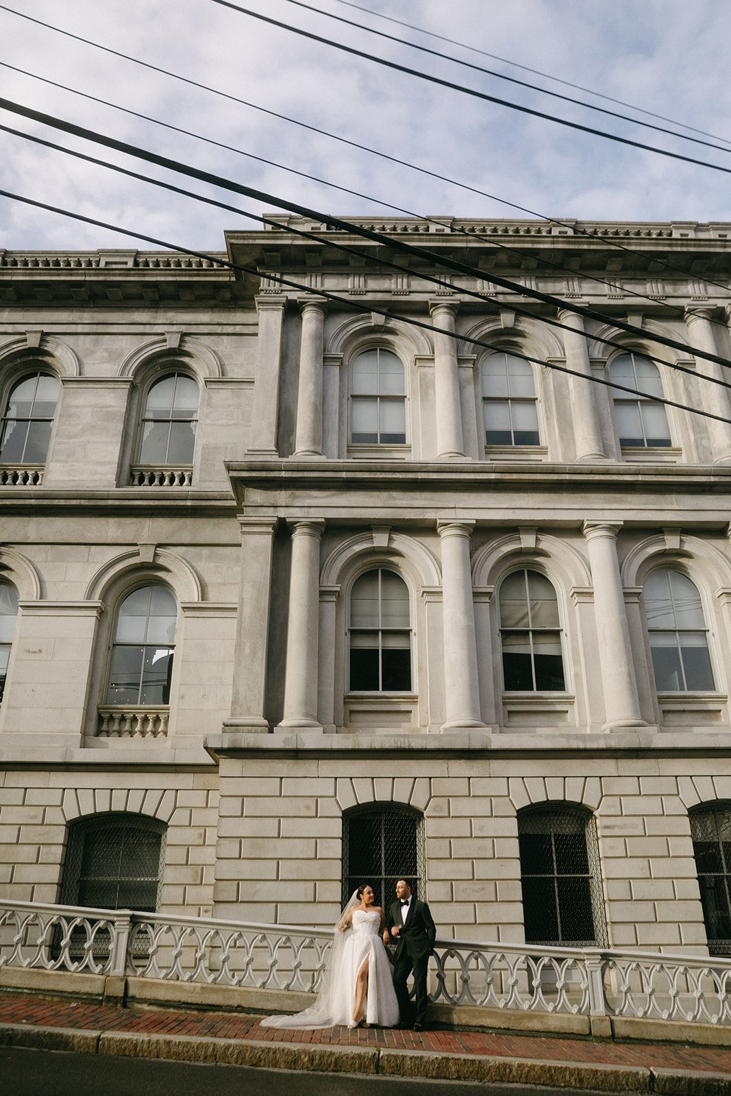 Kelsey and Jeremy’s wedding day in Portland was the perfect example of how to bring together beauty, history, and unforgettable experiences. The couple began their day with a heartfelt ceremony at the Maine Jewish Museum, a venue known for its intimate setting and historic charm. Following the ceremony, a light rain shower kept guests indoors, where they enjoyed cocktails, light bites, and the museum’s art exhibits on the main floor. As the skies cleared, Kelsey and Jeremy led their guests through the streets of Portland to the reception, serenaded by a live saxophonist— a uniquely personal touch. Their reception took place at the Custom House, where grand columns, sweeping architecture, and timeless elegance created a striking contrast to the ceremony’s intimacy. The design aesthetic embraced a sophisticated, nature-inspired palette of earthy tones, subtle chartreuse accents, and rich brown textures for a look that felt both organic and refined. For their cocktail-style reception, Kelsey and Jeremy invited guests to indulge in incredible cuisine, spend the evening on the dance floor, and celebrate alongside them in a lively, joy-filled atmosphere.
